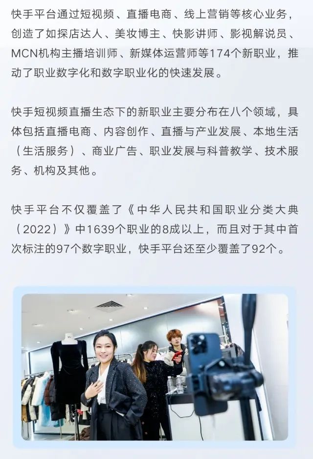 另外,快手平台通过短视频、直播电商、线上营销等核心业务,创造了如探店达人、美妆博主、快影讲师、影视解说员、MCN机构主播培训师、新媒体运营师等174个新职业,推动了职业数字化和数字职业化的快速发展。