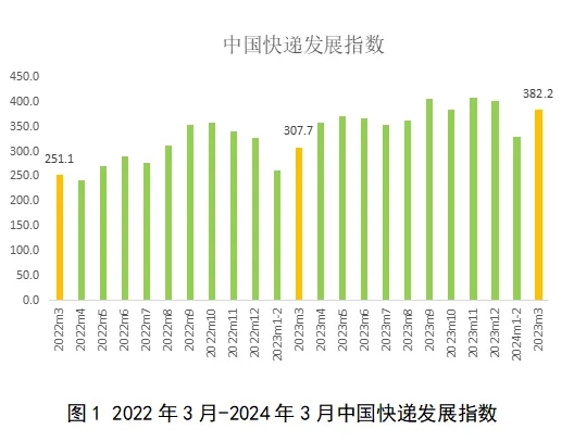 经测算,2024年3月中国快递发展指数为382.2,同比提升24.2%。其中发展规模指数、服务质量指数和发展能力指数分别为518.7、502.8、229.7,同比分别提升26.9%、38.2%、3.1%,发展趋势指数为68.4。3月,快递业运行整体保持畅通稳定,市场规模持续扩大,提质增效步伐稳健,发展势头持续向好。