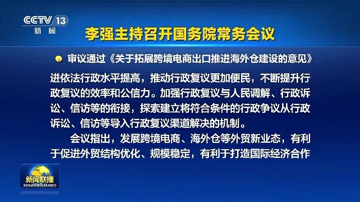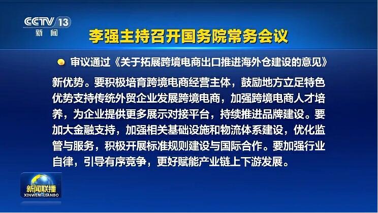 媒体报道李强主持召开国务院常务会议 审议通过《关于拓展跨境电商出口推进海外仓建设的意见》