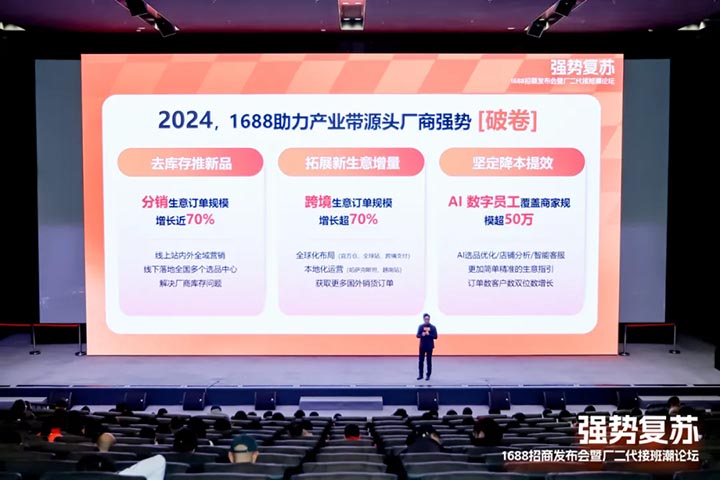 据悉,1688日前启动“产业带强势复苏”招商活动。本次招商的对象是产业带源头厂商,重点是正经历“厂二代”接班、加速数字化转型、拥抱AI技术应用和尝试跨境市场的工厂,尤其是具备小单快返和轻定制能力的品牌代工厂以及“专精特新”企业。1688将为商家提供“双保”服务,即保证获客数量和订单数量,保证商家有合理利润去做工厂数字化转型升级。