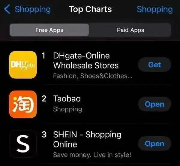 中国跨境电商应用在美国火了!4月16日,美国iOS应用商店电商应用榜单前三均为中国APP,第一为敦煌网,第二为淘宝,第三为希音Shein。